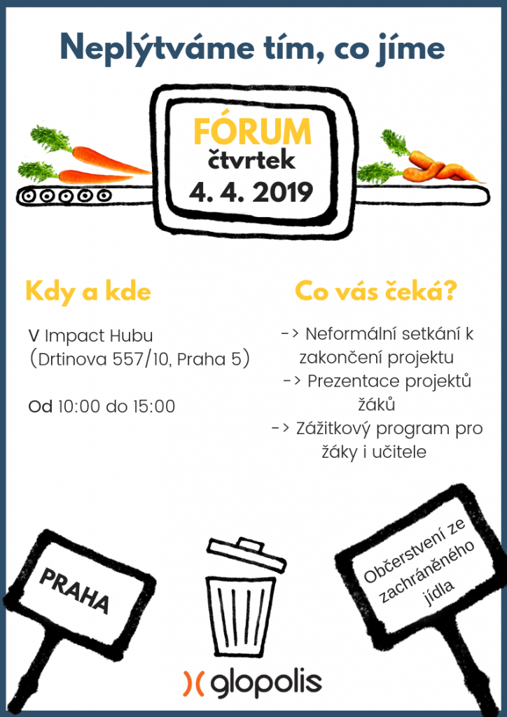 Srdečně Vás zveme na fórum Neplýtváme tím, co jíme, které se uskuteční 4.4.2019 10:00 – 15:00 v Impact Hub v Praze. Fórum je zaměřené na téma plýtvání potravinami a globální aspekty produkce a konzumace potravin na školách. Cílem je inspirovat se navzájem ve školních aktivitách na ZŠ směřujících k zodpovědné spotřebě potravin, zejména plýtvání potravinami a podpořit nastartování změn v našem vztahu k jídlu na školách i mimo ně.