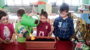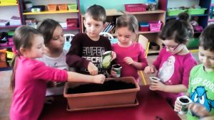 With the help of parents and teachers, the kids prepared a real hotbed for seeds. They collected old yoghurt cups and found suitable soil and seeds. However, their work was not over yet, they still had to take care of their hotbed by watering and thinning it on a regular basis. This way, the kids learnt about the life cycle of plants. They understood how a little seed could become a real plant that we could use for cooking. They could see how the seed grows up into a seedling, all thanks to their care and work. And then, when the time came, the seedlings were placed into the vegetable garden.